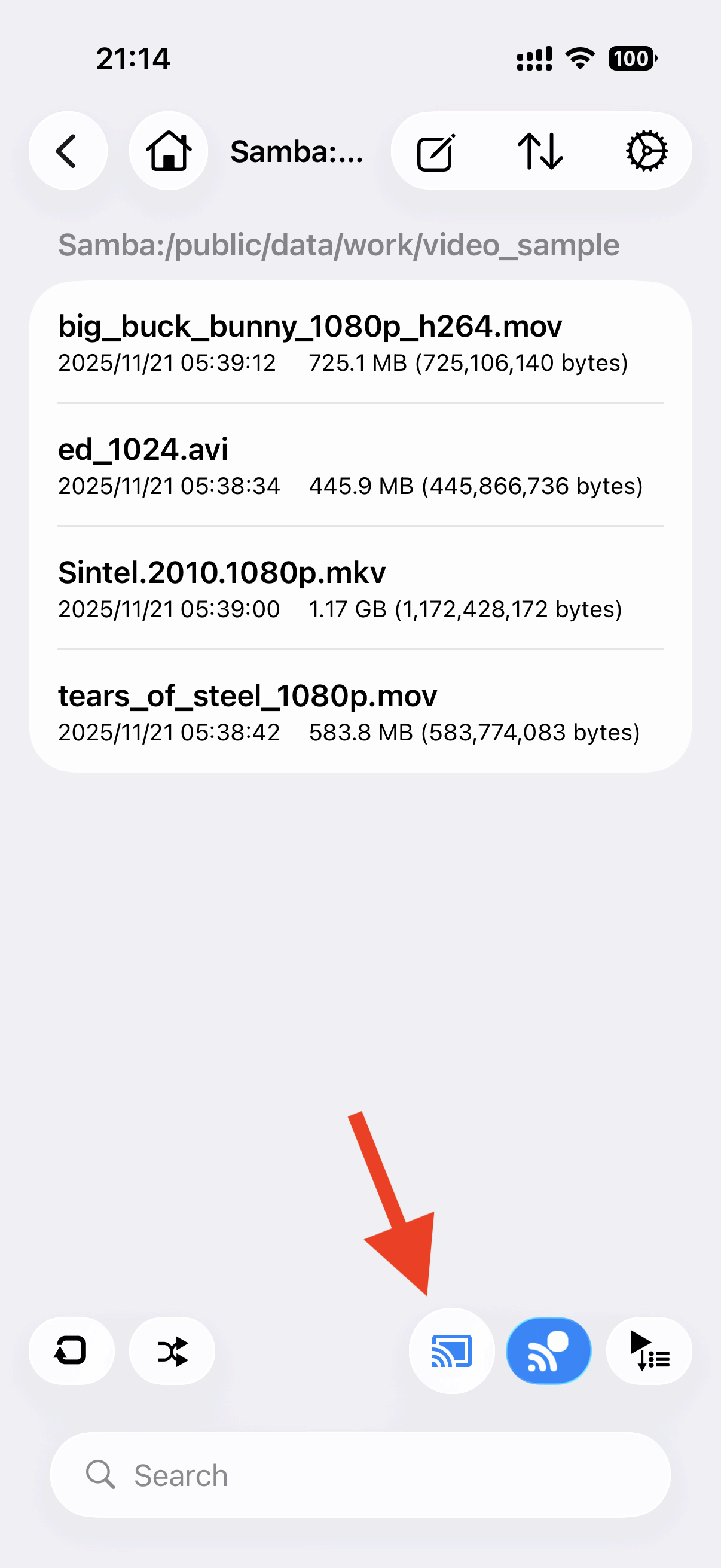 Tap the cast button on the right buttom and select the cast device. After cast mode on, select the media file that you want play.