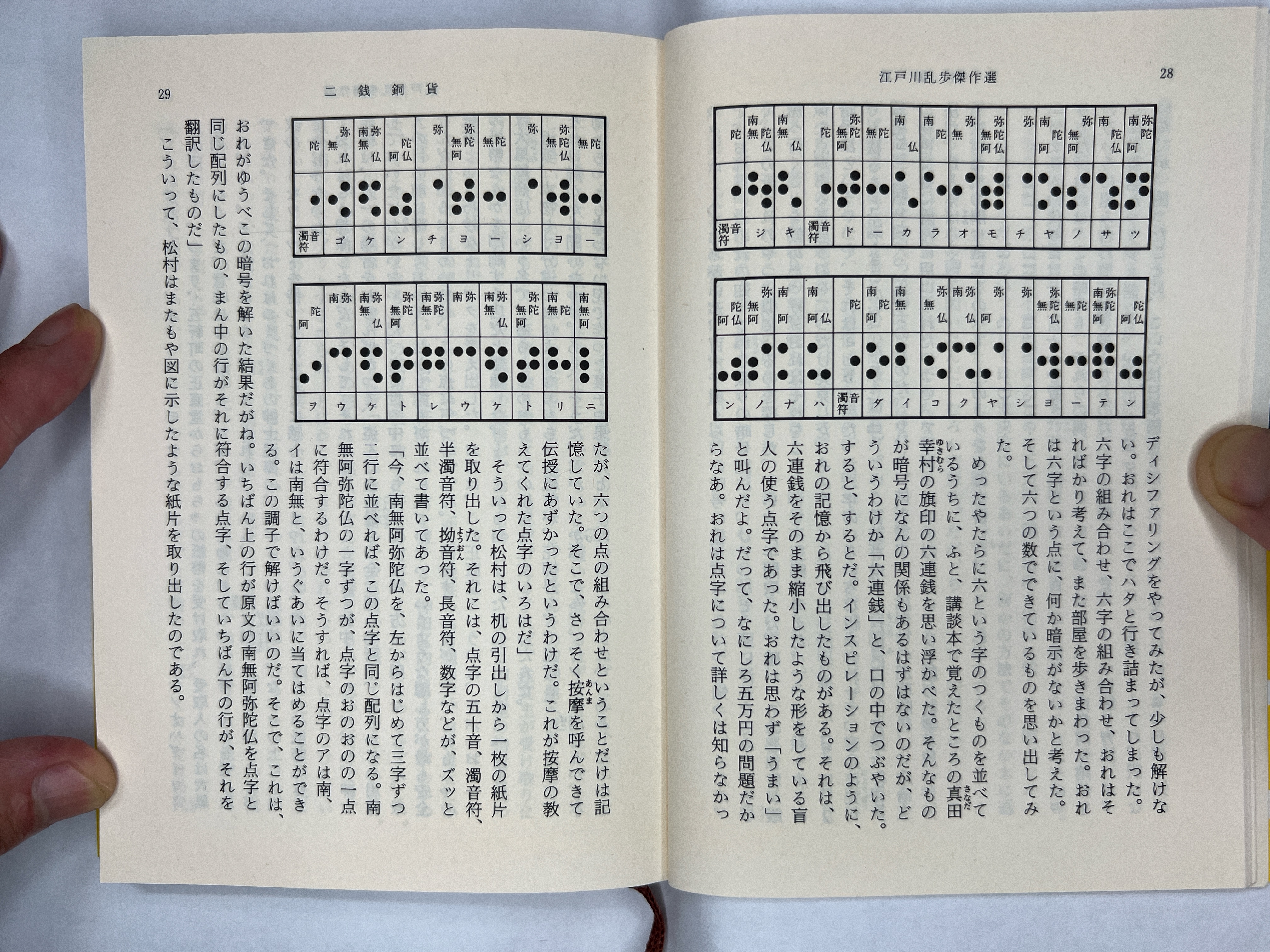 29 濁音 符 阿 ● � 陀 ● 陀 ● 二銭 無 ● ゴ ●● ゥ 弥 仏 ● ● 南弥 南弥 無 仏 ●● ● ● ケ 南弥 無 仏 ●● ● ● ヶ 銅貨 阿仏 陀 ● ●● ン 無陀 阿 弥 ● ●● ● ト ● ● チ ● 弥 南弥 無陀 レ ● ● 無陀 阿 弥 ● ●● ヨ 南弥 ●● ウ 無陀 ●● - 南弥 無 仏 ヶ シ ト 弥 ● 無陀 阿 弥 無陀 00 ● 南 ヨ 無陀 �� り 無陀 ●● - = 濁音 符 ン 陀 ● 阿仏 陀 南 無陀 仏 � ● �� 0 ノ ジ ● 弥 ナ キ 仏 ● ● ● 南 濁音 符 陀 阿仏 ハ � ● 無陀 阿 ド 濁音 符 弥 ● 陀 無陀 ● 南 ● ●● 阿 - ダ ● 陀 江戸川乱歩傑作選 南 ● ィ カ 仏 ● 南 ● 無 ● コ ラ 陀 ● ● 仏 弥 ● 無 ● オ ● 南弥 仏 ●● ● ク 弥 ● 無陀 阿仏 �� ● 阿 モ ャ ● ● 弥 ● 弥 チ シ ● ● 弥 ● ● 阿 南 ョ ヤ ● ノ 無陀無陀 ●● ● ● ● 陀 ● 阿 無 ●● - ● 弥 ● ● 南 サ 南弥 無陀 阿 テ ● ● ● 仏 陀 ● ● 阿仏 ●● ン 南弥 陀 阿 ツ 陀 ● ● 28 �● 弥 弥仏 南無 ●● ●● �● �� 南阿 南無 ●● 無阿 ●� ディシファリングをやってみたが、少しも解けな い。おれはここでハタと行き詰まってしまった。 六字の組み合わせ、六字の組み合わせ、おれはそ ればかり考えて、また部屋を歩きまわった。おれ は六字という点に、何か暗示がないかと考えた。 そして六つの数でできているものを思い出してみ た。 めったやたらに六という字のつくものを並べて いるうちに、ふと、講談本で覚えたところの真田 幸村の旗印の六連銭を思い浮かべた。そんなもの が暗号になんの関係もあるはずはないのだが、ど ういうわけか「六連銭」と、口の中でつぶやいた。 すると、するとだ。インスピレーションのように、 おれの記憶から飛び出したものがある。それは、 六連銭をそのまま縮小したような形をしている盲 人の使う点字であった。おれは思わず「うまい」 と叫んだよ。だって、なにしろ五万円の問題だか らなあ。おれは点字について詳しくは知らなかっ たが、六つの点の組み合わせということだけは記 憶していた。そこで、さっそく按摩を呼んできて 伝授にあずかったというわけだ。これが按摩の教 えてくれた点字のいろはだ」 そういって松村は、机の引出しから一枚の紙片 を取り出した。それには、点字の五十音、濁音符、 半濁音符、拗音符、長音符、数字などが、ズッと 並べて書いてあった。 「今、南無阿弥陀仏を、左からはじめて三字ずつ 二行に並べれば、この点字と同じ配列になる。南 無阿弥陀仏の一字ずつが、点字のおのおのの一点 に符合するわけだ。そうすれば、点字のアは南、 イは南無と、いうぐあいに当てはめることができ る。この調子で解けばいいのだ。そこで、これは、 おれがゆうべこの暗号を解いた結果だがね。いちばん上の行が原文の南無阿弥陀仏を点字と 同じ配列にしたもの、まん中の行がそれに符合する点字、そしていちばん下の行が、それを 翻訳したものだ」 こういって、松村はまたもや図に示したような紙片を取り出したのである。 南無阿 弥仏 ●●