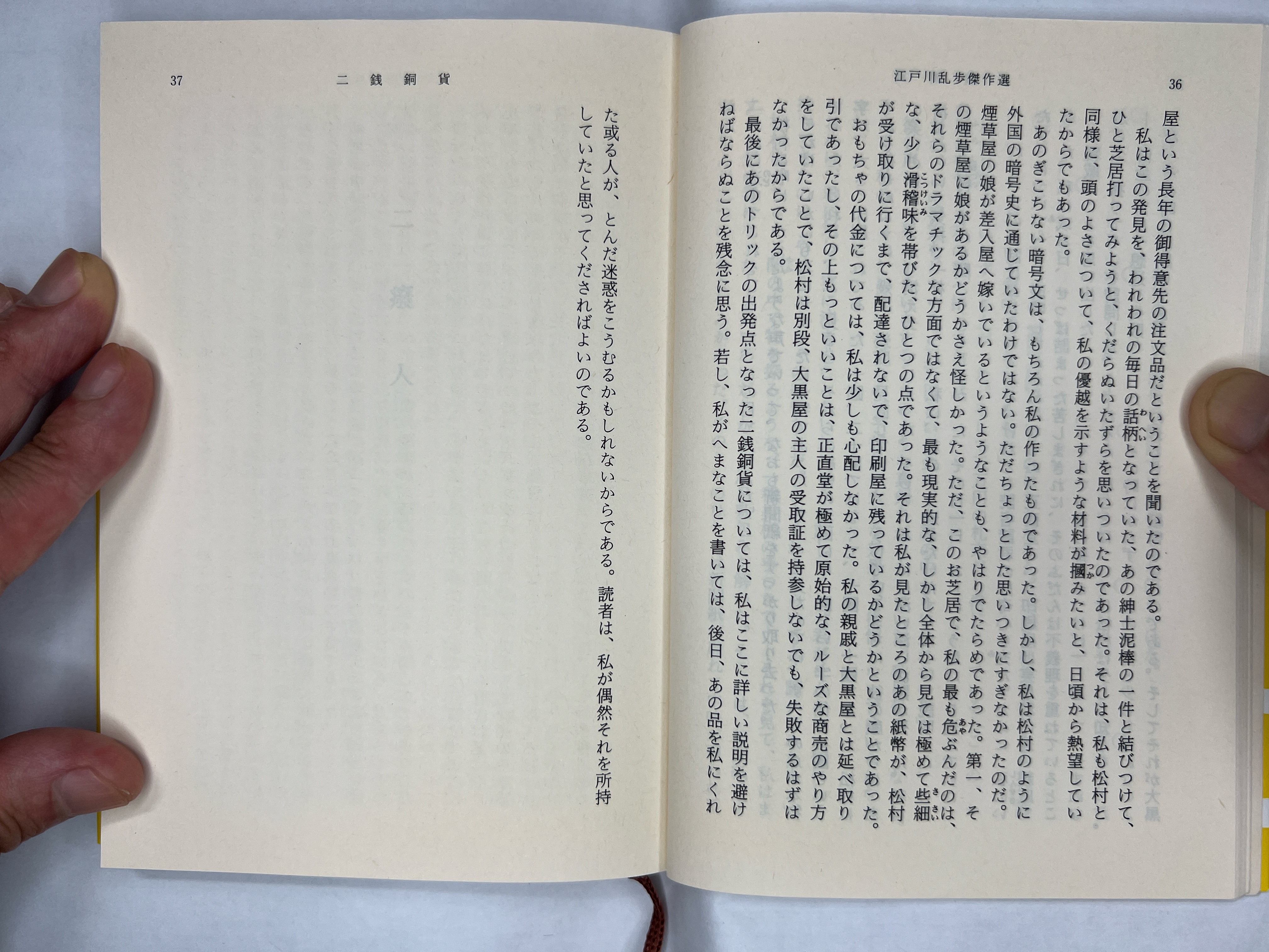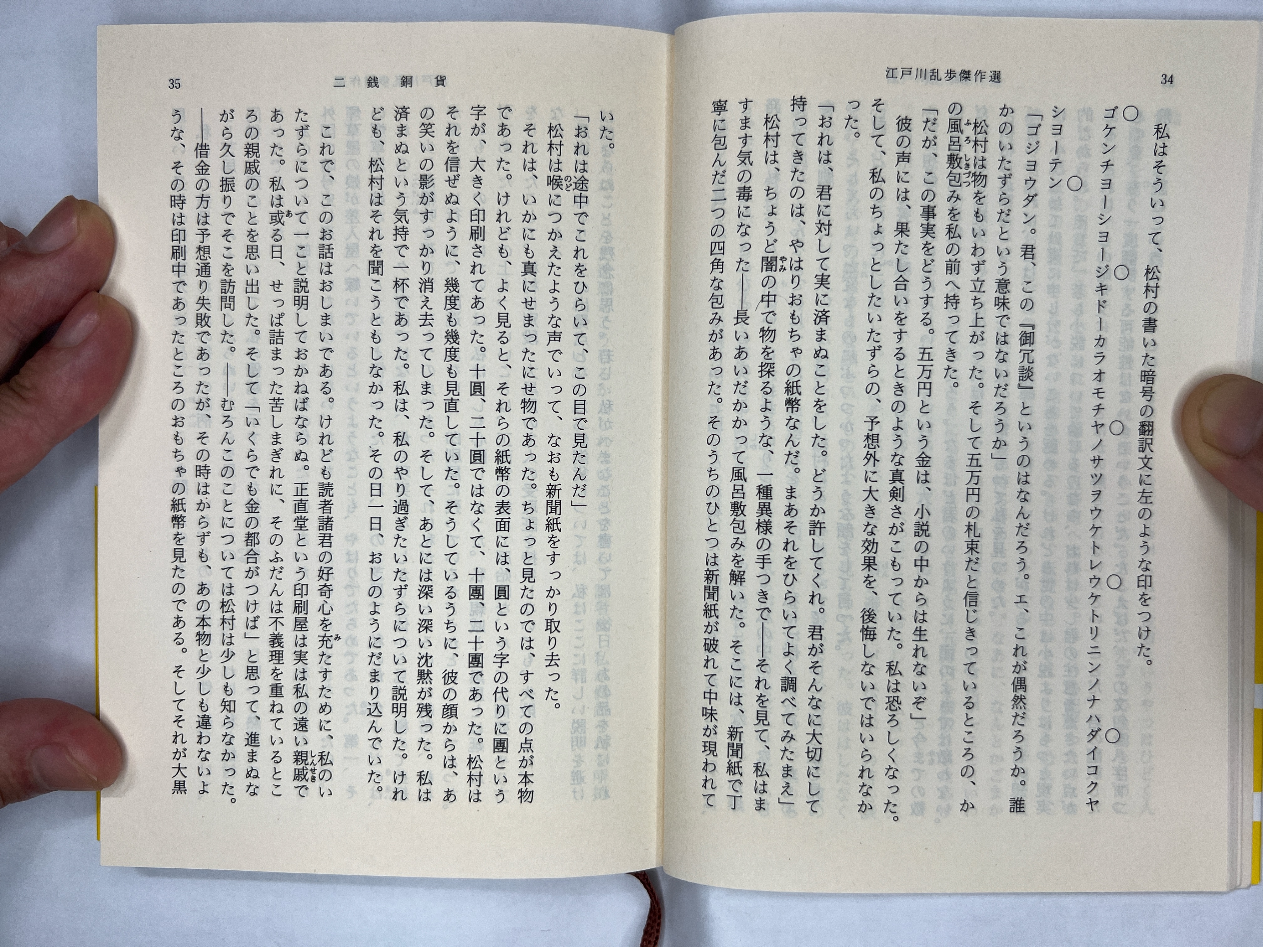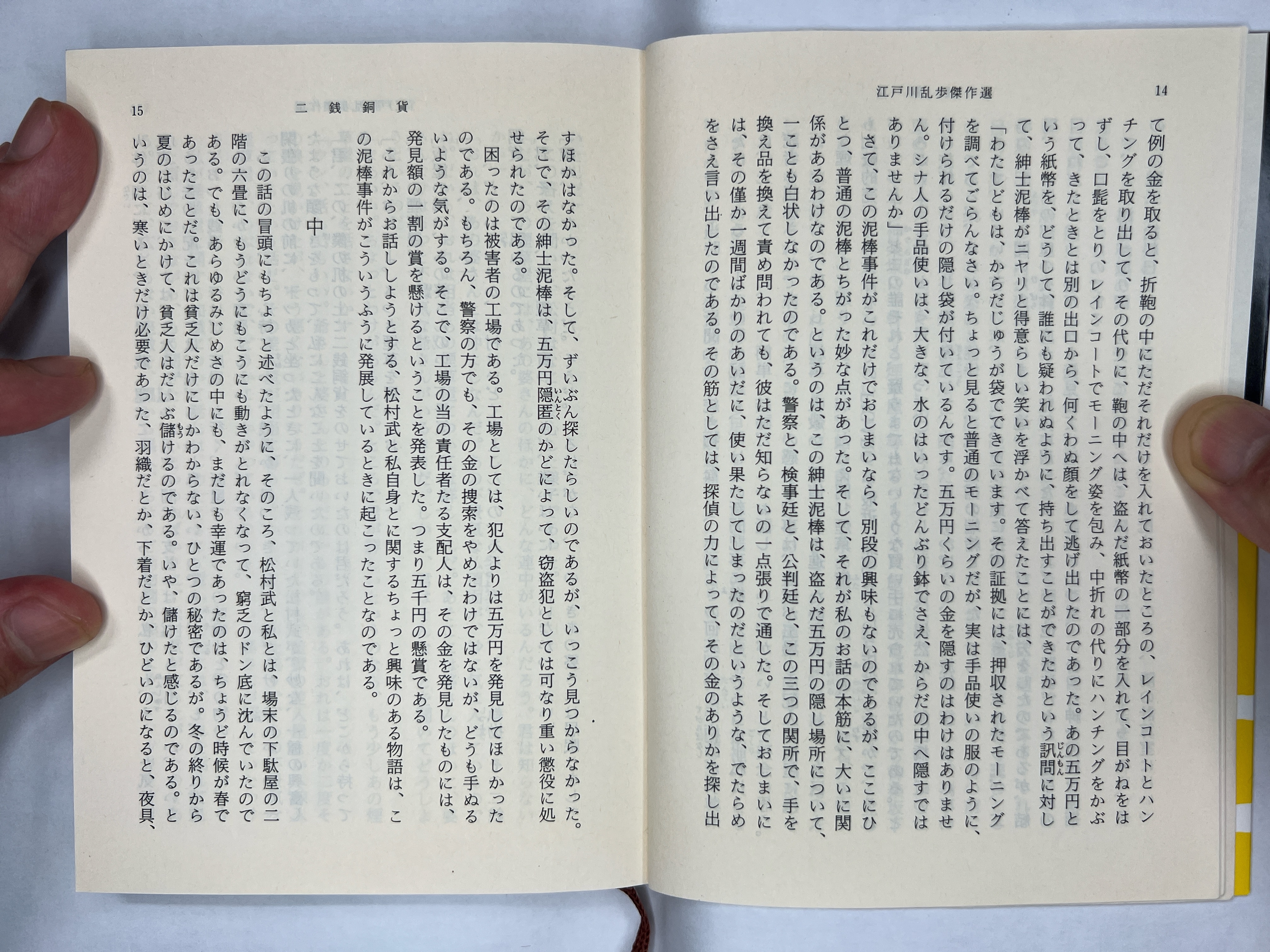 江戸川乱歩傑作選 著:江戸川乱歩 https://www.shinchosha.co.jp/book/114901/ より 「二銭銅貨」