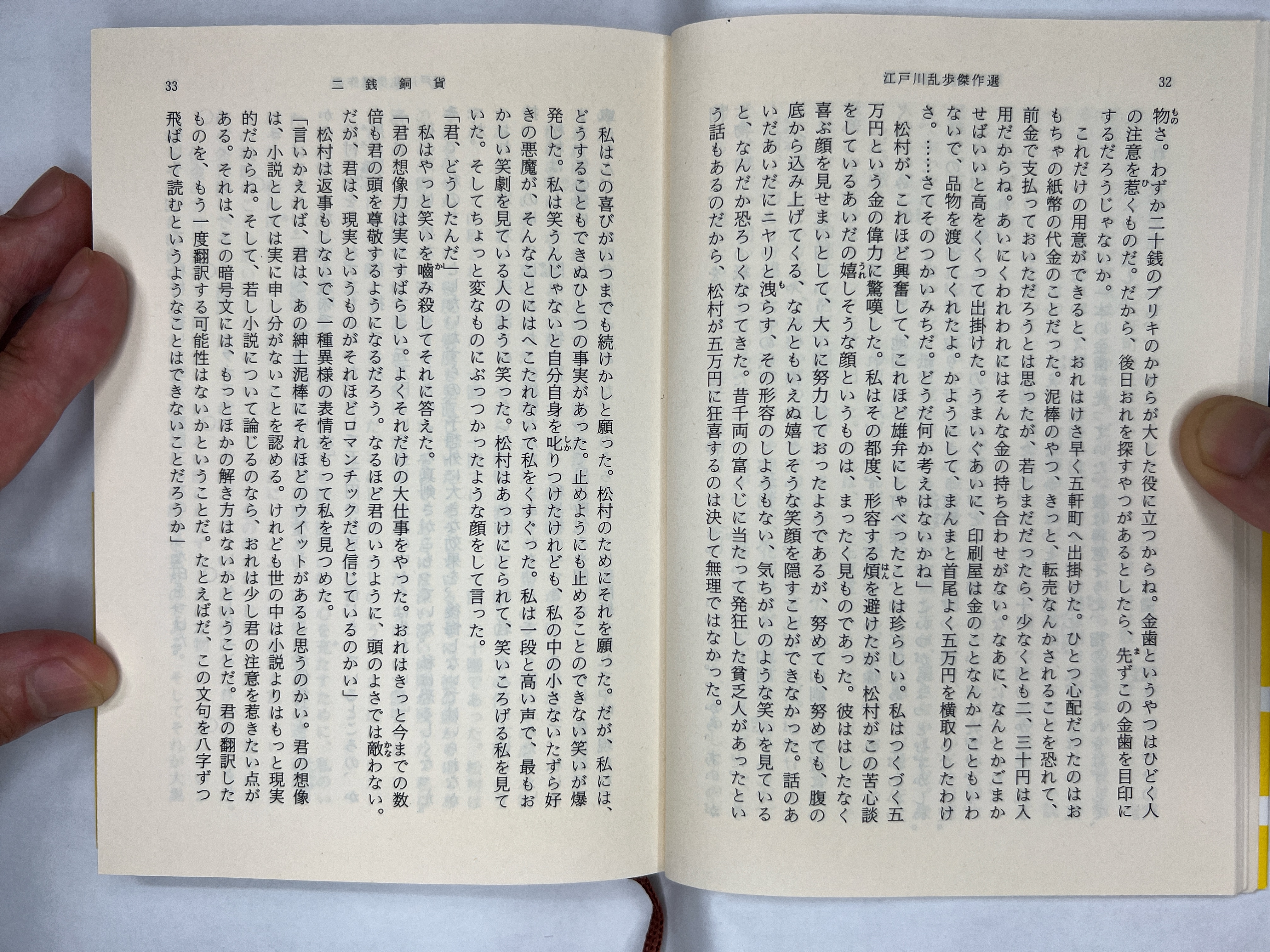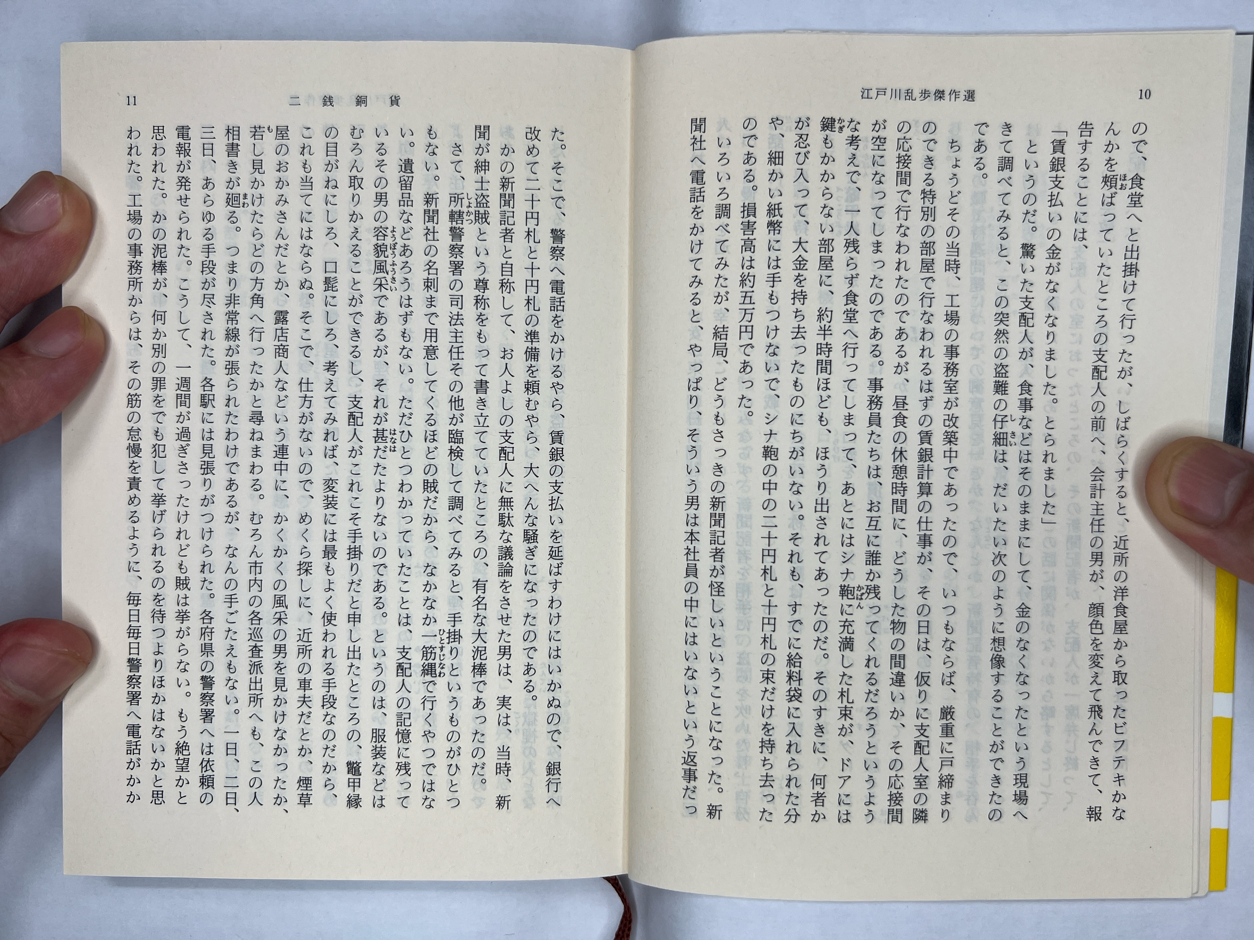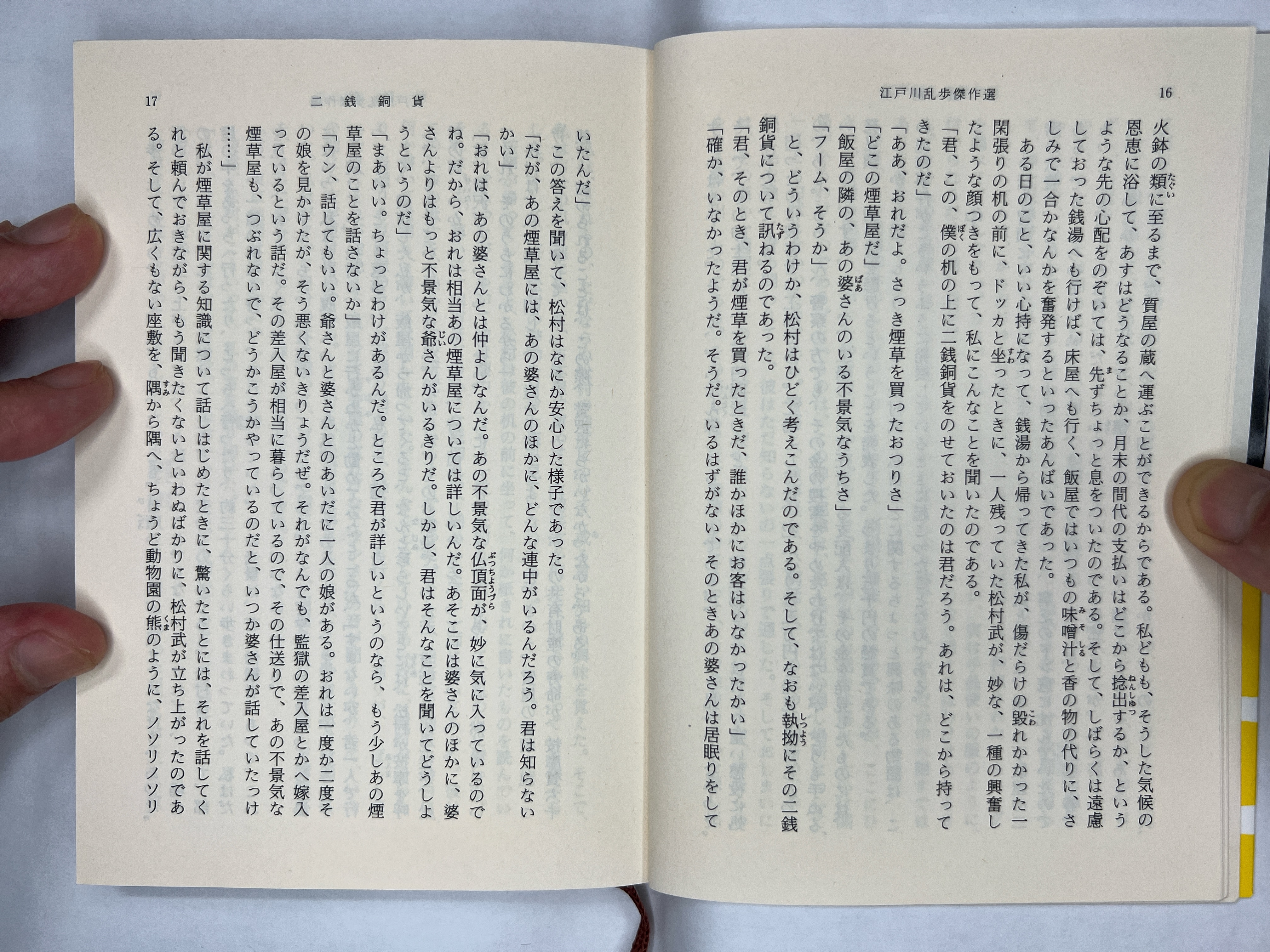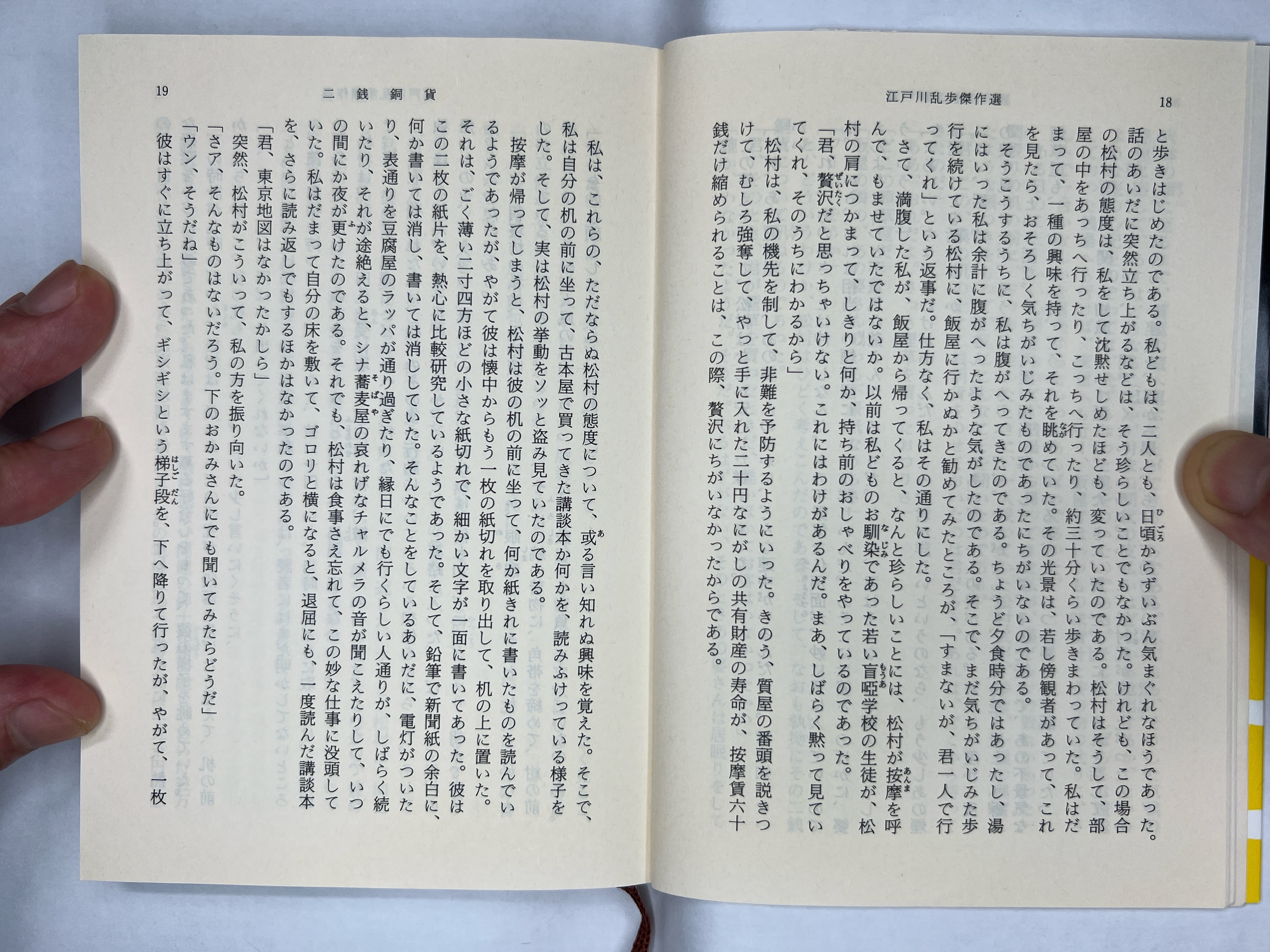 江戸川乱歩傑作選 著:江戸川乱歩 https://www.shinchosha.co.jp/book/114901/ より 「二銭銅貨」