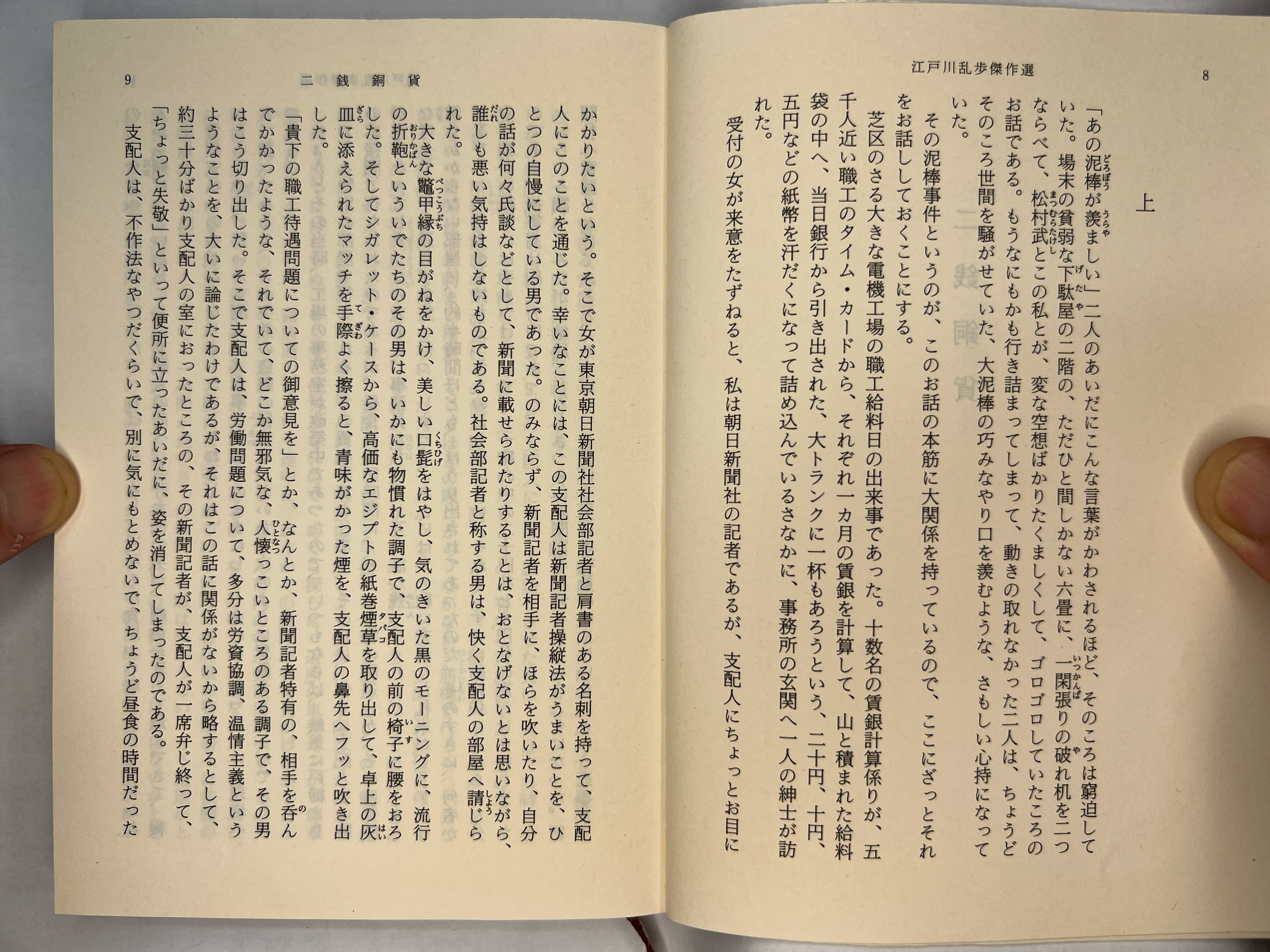9 二銭 銅貨 江戸川乱歩傑作選 上 8 「あの泥棒 が羨 ましい」二人のあいだにこんな言葉がかわされるほど、そのころは窮迫して いた。場末の貧弱な下駄屋 の二階の、ただひと間しかない六畳に、一閑張 りの破 れ机を二つ ならべて、松村武 とこの私とが、変な空想ばかりたくましくして、ゴロゴロしていたころの お話である。もうなにもかも行き詰まってしまって、動きの取れなかった二人は、ちょうど そのころ世間を騒がせていた、大泥棒の巧みなやり口を羨むような、さもしい心持になって いた。 その泥棒事件というのが、このお話の本筋に大関係を持っているので、ここにざっとそれ をお話ししておくことにする。 芝区のさる大きな電機工場の職工給料日の出来事であった。十数名の賃銀計算係りが、五 千人近い職工のタイム・カードから、それぞれ一カ月の賃銀を計算して、山と積まれた給料 袋の中へ、当日銀行から引き出された、大トランクに一杯もあろうという、二十円、十円、 五円などの紙幣を汗だくになって詰め込んでいるさなかに、事務所の玄関へ一人の紳士が訪 れた。 受付の女が来意をたずねると、私は朝日新聞社の記者であるが、支配人にちょっとお目に かかりたいという。そこで女が東京朝日新聞社社会部記者と肩書のある名刺を持って、支配 人にこのことを通じた。幸いなことには、この支配人は新聞記者操縦法がうまいことを、ひ とつの自慢にしている男であった。のみならず、新聞記者を相手に、ほらを吹いたり、自分 の話が何々氏談などとして、新聞に載せられたりすることは、おとなげないとは思いながら、誰 しも悪い気持はしないものである。社会部記者と称する男は、快く支配人の部屋へ請 じら れた。 大きな鼈甲縁 の目がねをかけ、美しい口髭 をはやし、気のきいた黒のモーニングに、流行 の折鞄 といういでたちのその男は、いかにも物慣れた調子で、支配人の前の椅子 に腰をおろ した。そしてシガレット・ケースから、高価なエジプトの紙巻煙草 を取り出して、卓上の灰 皿 に添えられたマッチを手際 よく擦ると、青味がかった煙を、支配人の鼻先へフッと吹き出 した。 「貴下の職工待遇問題についての御意見を」とか、なんとか、新聞記者特有の、相手を呑 ん でかかったような、それでいて、どこか無邪気な、人懐 っこいところのある調子で、その男 はこう切り出した。そこで支配人は、労働問題について、多分は労資協調、温情主義という ようなことを、大いに論じたわけであるが、それはこの話に関係がないから略するとして、 約三十分ばかり支配人の室におったところの、その新聞記者が、支配人が一席弁じ終って、 「ちょっと失敬」といって便所に立ったあいだに、姿を消してしまったのである。 支配人は、不作法なやつだくらいで、別に気にもとめないで、ちょうど昼食の時間だった