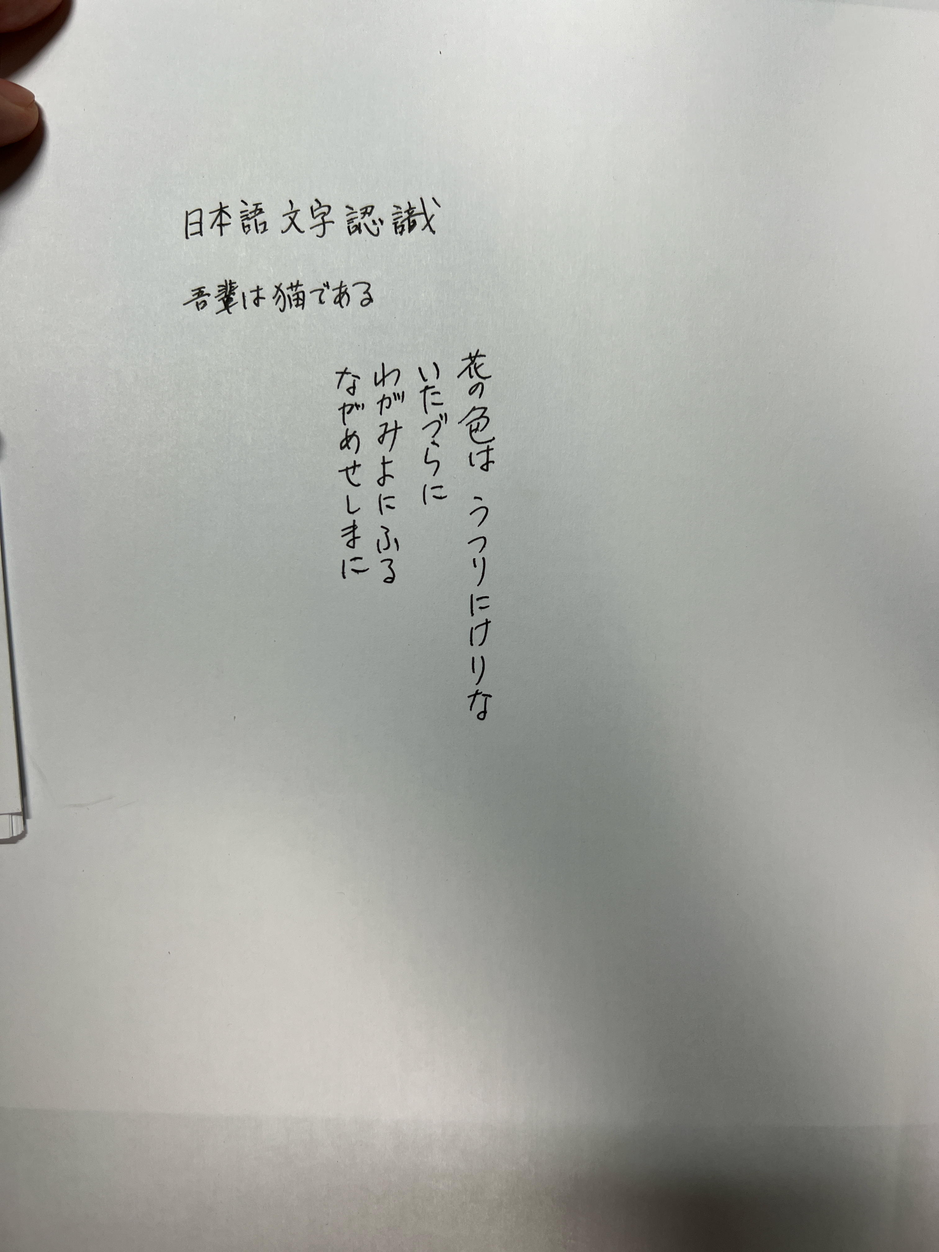 日本語文字認識 吾輩は猫である 花の色はうつりにけりな いたづらに わがみよにふる ながめせしまに