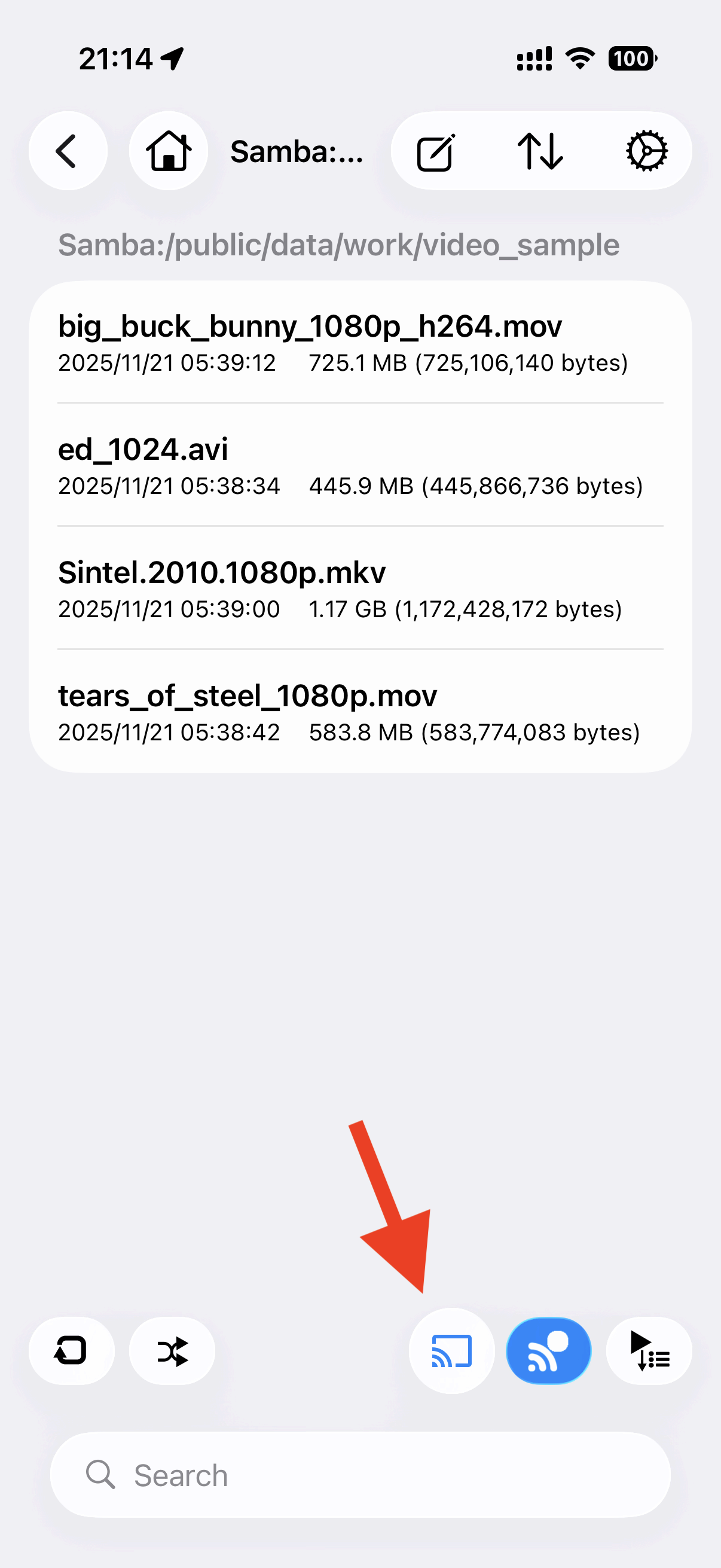 Tap the cast button on the right buttom and select the cast device. After cast mode on, select the media file that you want play.