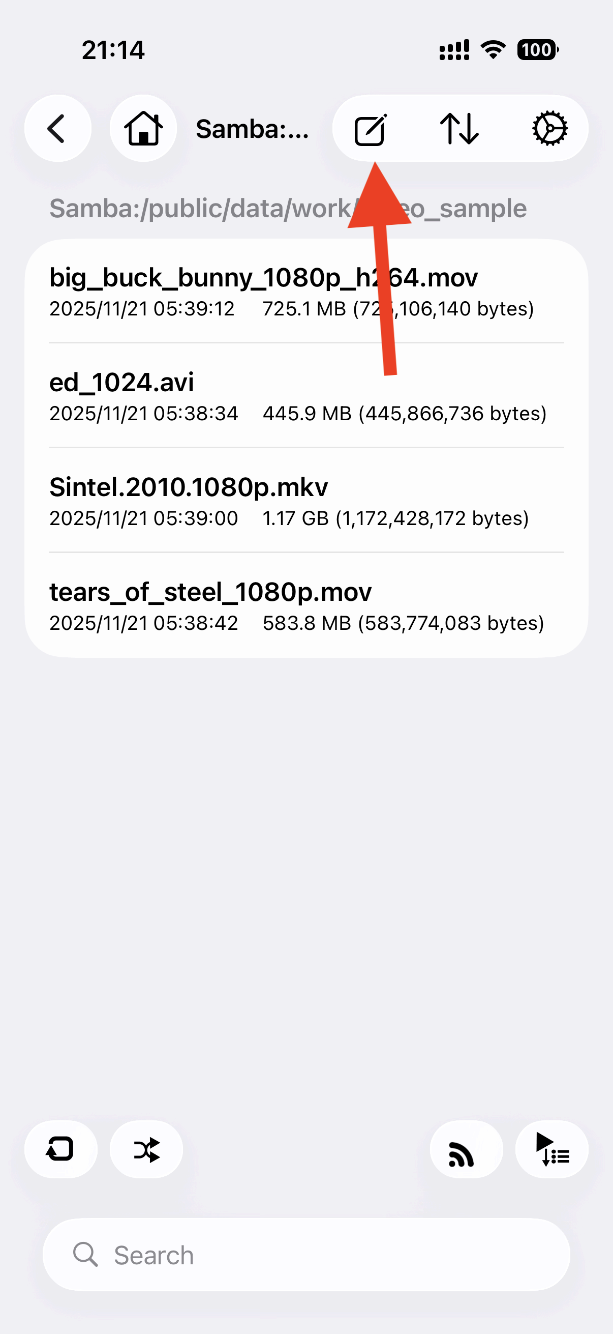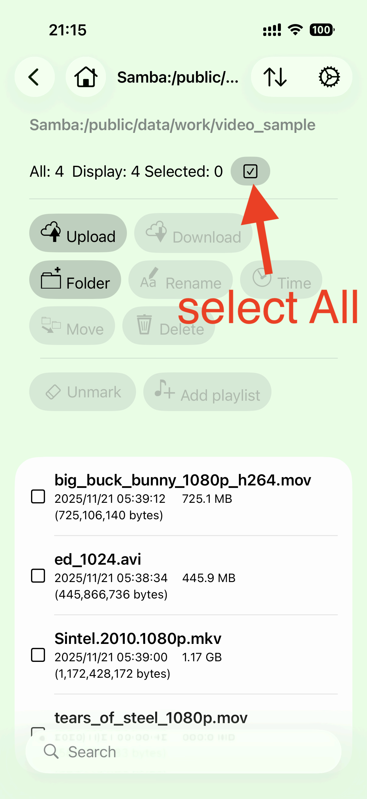 In edit mode, items can be edited. Upload and Download, make new folder, rename, modify time, move, delete are available. And also you can unmark the played items, you can send items to playlist.