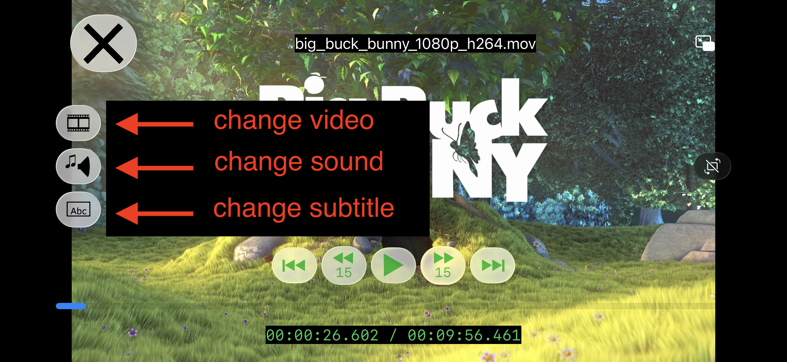 In software player, tap the screen to display or hide controller. The media has multiple video tracks, audio tracks or subtitles, select them in the left buttons.