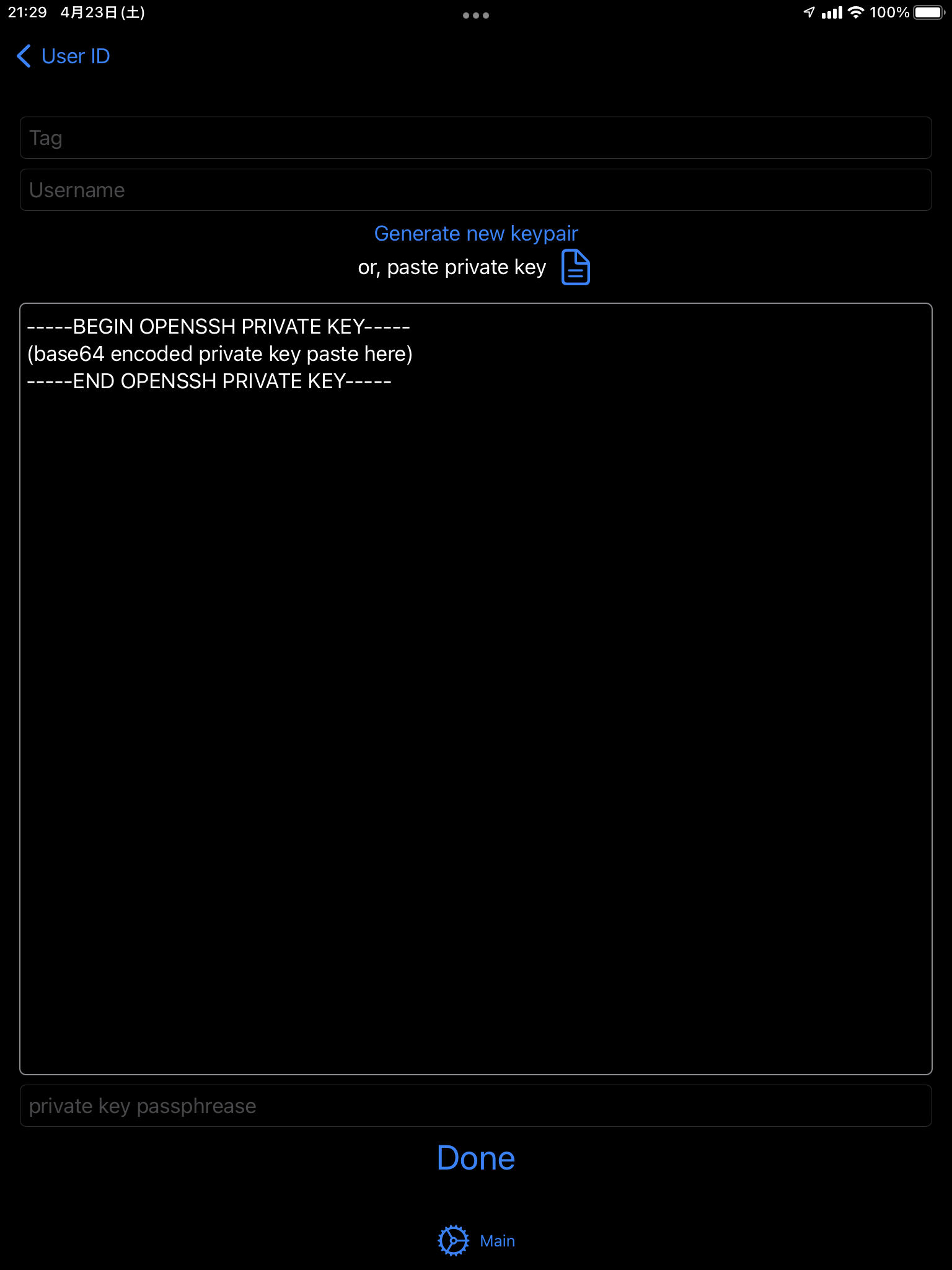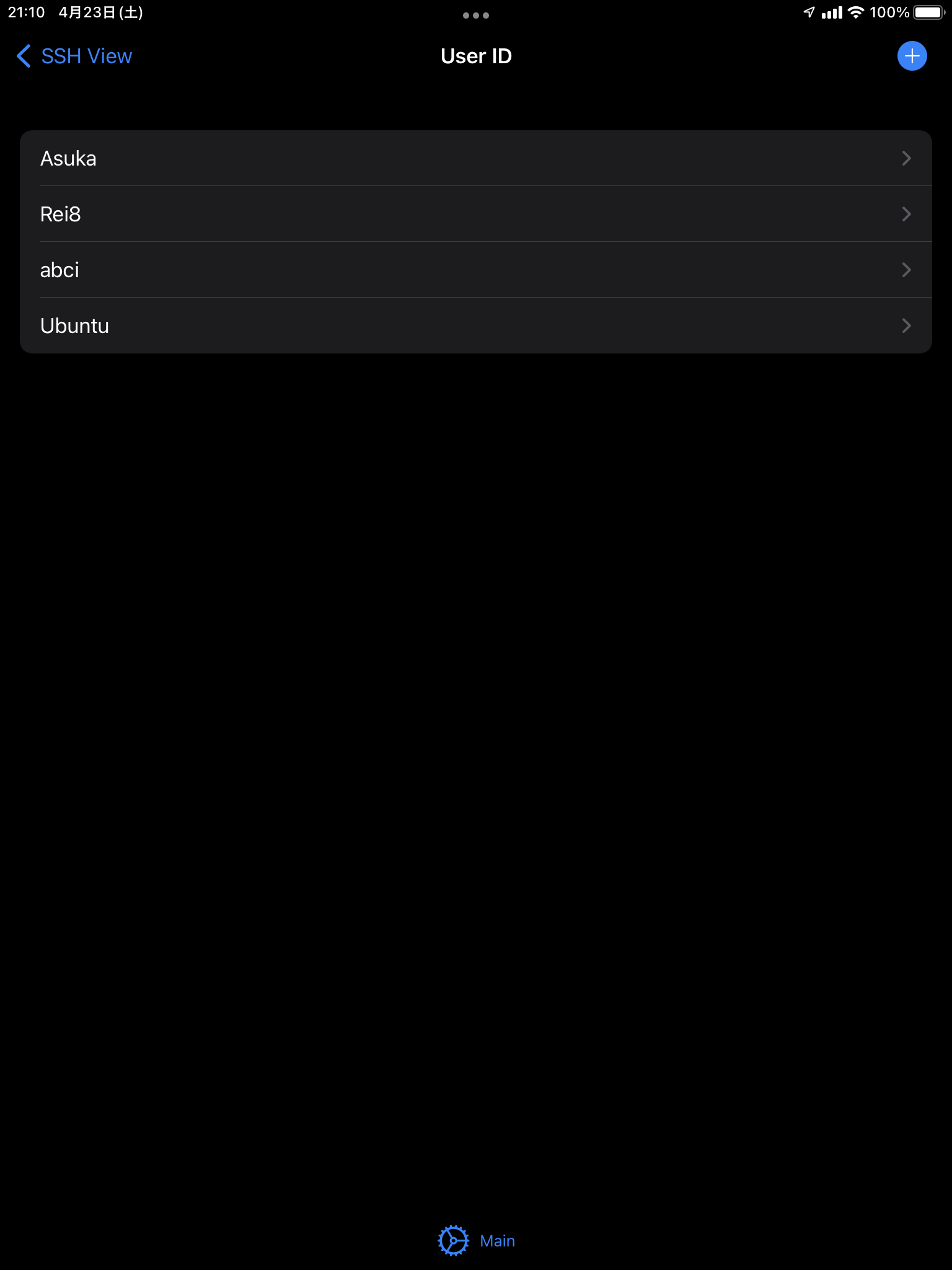 最初に、ユーザー認証用のデータを作成します。 アプリのトップを開き、"User ID"をタップして、右上の + ボタンから追加します。