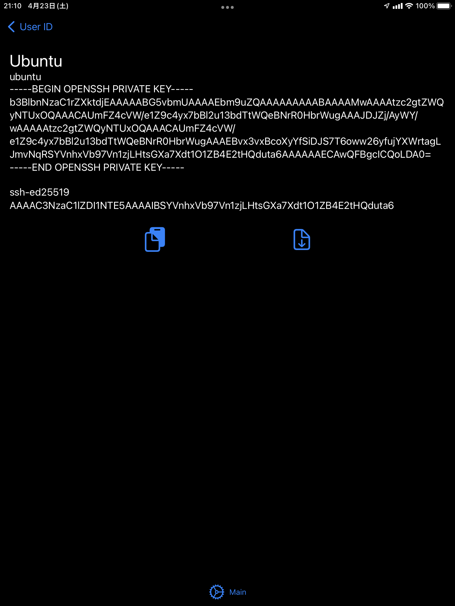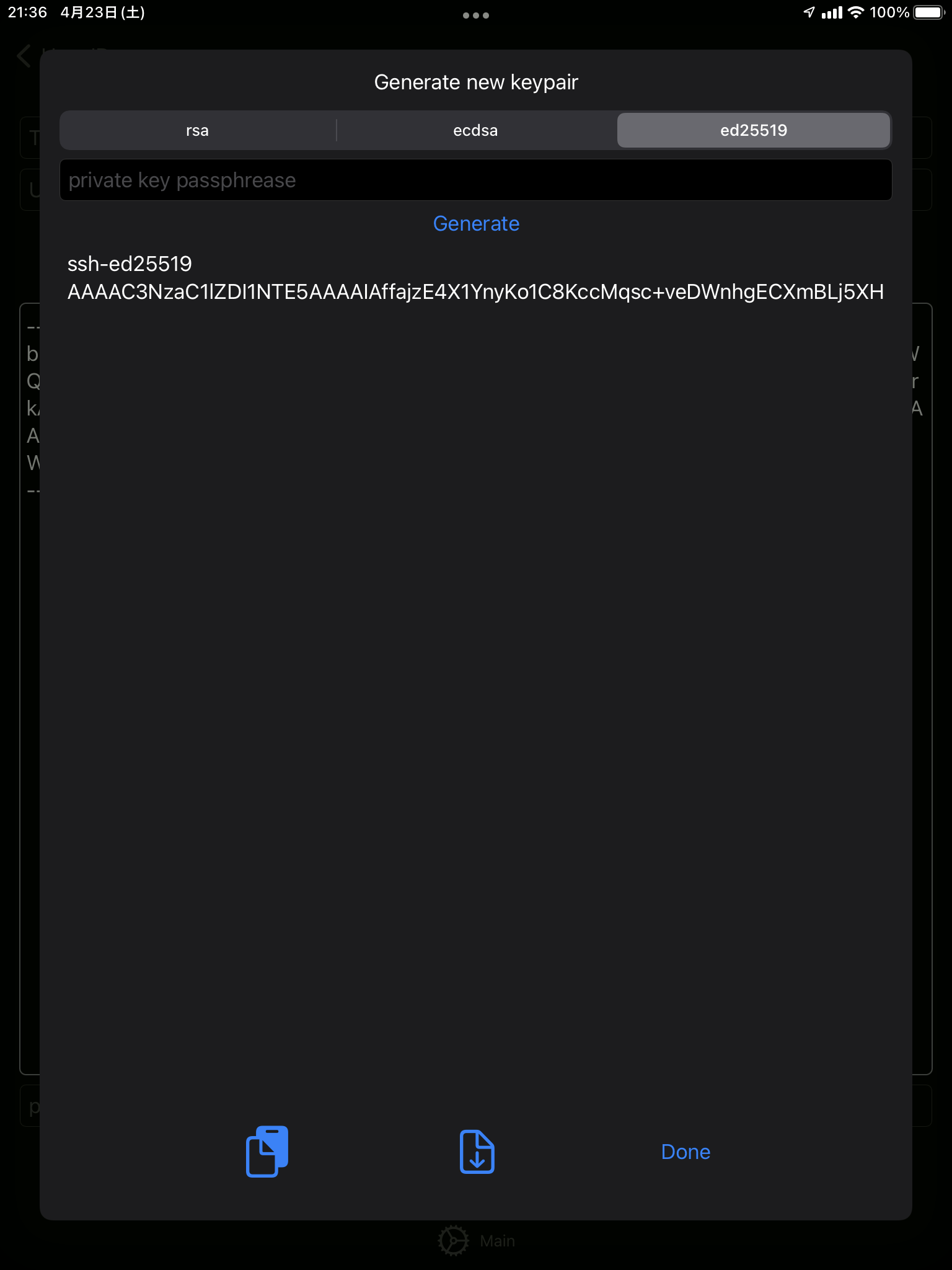 鍵ペアの作成では、鍵タイプを選び、パスフレーズによる保護が必要であれば入力し、generateをタップします。 作成された後は、公開鍵をクリップボードにコピーするか、ファイルに書き出すことができます。 このとき秘密鍵は自動でユーザー情報に追加されます。