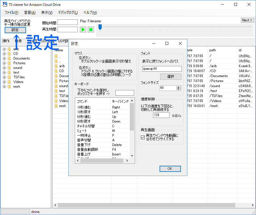 再生ウインドウでのキー入力はデフォルトで以下の通りですが、割当を設定から変えることができます。