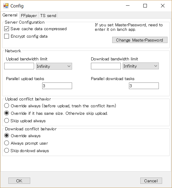 メニューのConfig->Generalから、Server ConfigurationのEncrypt config dataにチェックを入れ、 Change MasterPasswordボタンを押してマスターパスワードを変更してください。