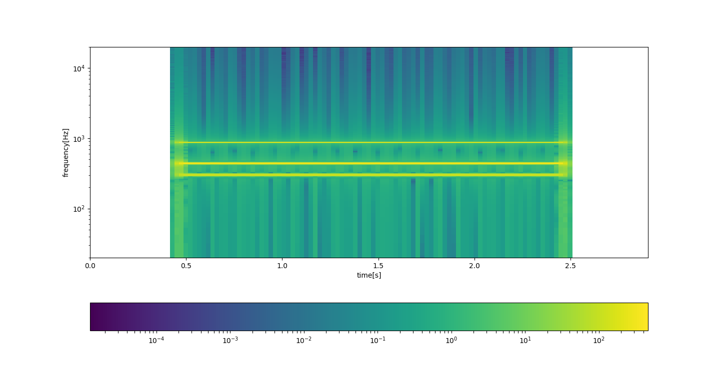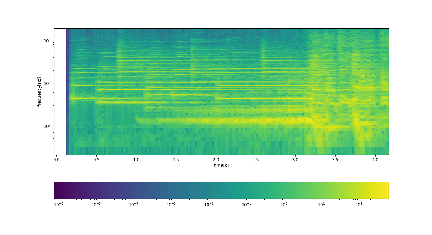 NFFT=4096という大きめの解析幅を用いているので、混合sin波やスイープ信号はうまく捉えられています。 しかしながら、楽曲の解析においては低音領域においてまだ分離が十分ではなく、4096/44100=90msの時間分解能もまた十分とは言えず、ぼんやりとした結果が得られています。